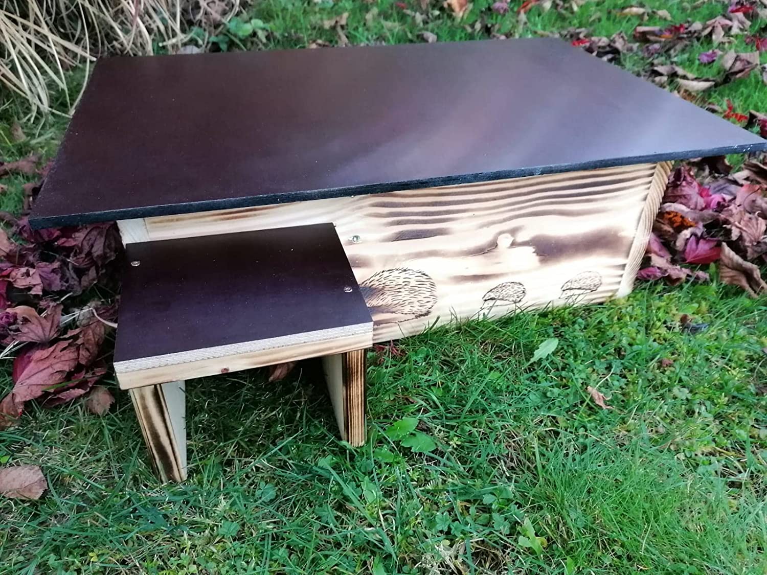 - Igelhaus aus stabilem 20mm starken Vollholz – gebrannt. Das Dach ist ebenfalls Witterungsbeständig.